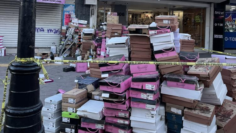 Mercancía abandonada: Tras el retiro del mobiliario y la ropa, decenas de cajas que contenían calzado nuevo fueron dejadas en la banqueta, generando una gran expectativa entre los curiosos que transitaban por el lugar.