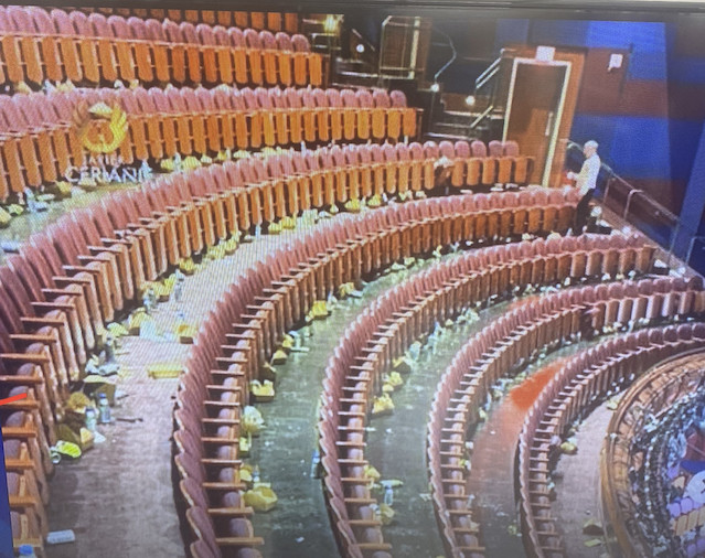 Bajo las butacas donde hace minutos se sentaban los rostros más bellos y caros del planeta, quedaron los restos del festín. Fue una alfombra roja de vasos de plástico, programas arrugados y empaques de snacks (porque, seamos honestos, nadie aguanta tres horas de discursos con el estómago vacío).