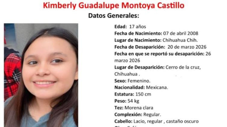 Chihuahua.- La Fiscalía General del Estado (FGE) emitió una ficha de búsqueda urgente este jueves 26 de marzo para localizar a Kimberly Guadalupe Montoya Castillo, una adolescente de 17 años de edad. La joven fue vista por última vez el pasado 20 de marzo en la colonia Cerro de la Cruz, en la capital del estado, y desde entonces sus familiares desconocen su paradero, lo que activó los protocolos de búsqueda inmediata.