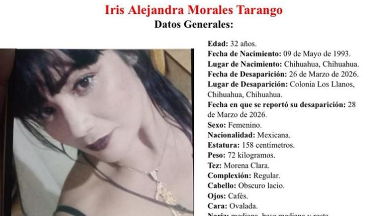 Chihuahua.- La Fiscalía General del Estado (FGE) de Chihuahua emitió una ficha de búsqueda urgente para localizar a Iris Alejandra Morales Tarango, quien fue vista por última vez el pasado jueves 26 de marzo de 2026. Su desaparición fue reportada formalmente este sábado 28 de marzo, luego de que perdiera contacto con sus familiares en la colonia Los Llanos, ubicada al sur de la ciudad de Chihuahua.
