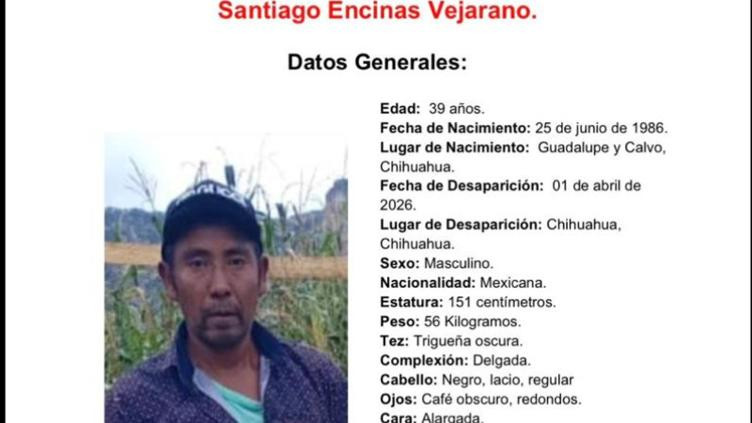 Chihuahua.- La Fiscalía General del Estado (FGE) solicita la colaboración urgente de la ciudadanía para localizar a Santiago Encinas Vejarano, de 39 años, quien fue visto por última vez el pasado 1 de abril de 2026. De acuerdo con la denuncia presentada por sus familiares, el hombre salió de su domicilio ubicado en la colonia Cerro de la Cruz, en la capital del estado, y desde entonces se desconoce su paradero.