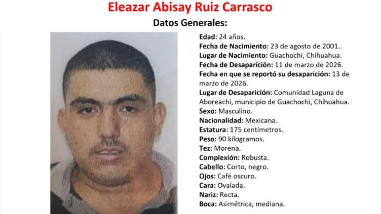 Guachochi.- La Fiscalía General del Estado de Chihuahua emitió una alerta oficial para localizar a Eleazar Abisay Ruíz Carrasco, de 24 años de edad, quien fue visto por última vez el pasado 11 de marzo en el municipio de Guachochi. La familia del joven perdió contacto con él en la comunidad de Laguna de Aboreachi y, tras casi dos semanas sin noticias de su paradero, solicitan el apoyo urgente de la ciudadanía para lograr su localización sano y salvo.