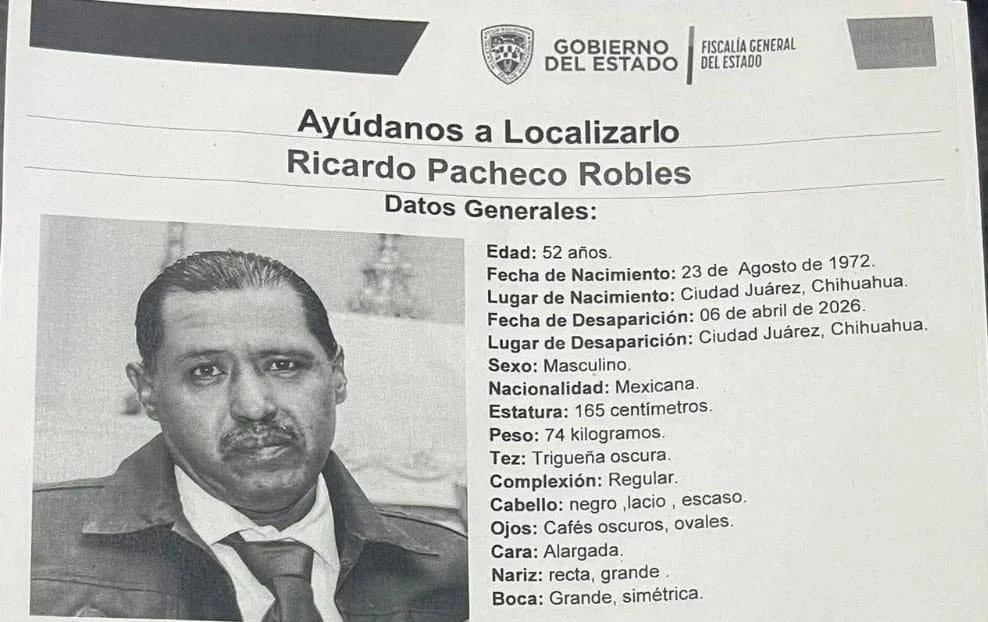 Juárez.- La Fiscalía General del Estado (FGE), a través de la Comisión Local de Búsqueda, ha emitido una pesquisa oficial para localizar a Ricardo Pacheco Robles, de 52 años de edad. Sus familiares interpusieron la denuncia por desaparición el pasado martes, señalando que el último contacto con él ocurrió el 6 de abril de 2026.