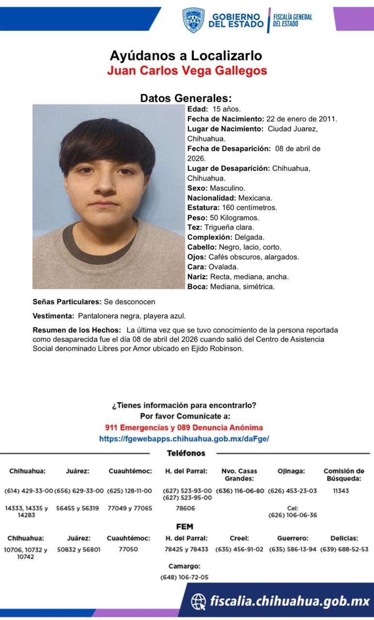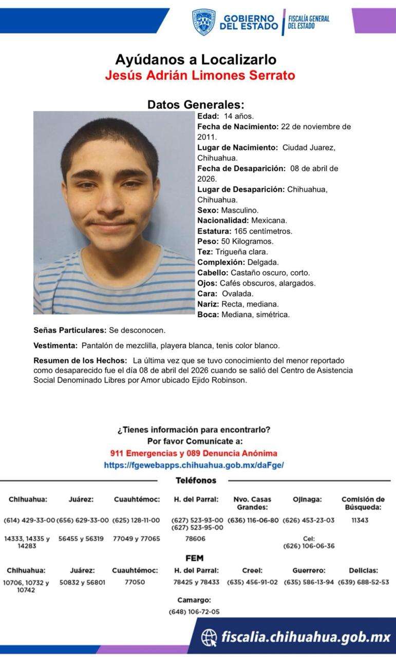Chihuahua.- La Fiscalía General del Estado y diversas corporaciones de seguridad han solicitado la colaboración urgente de la ciudadanía para localizar a dos adolescentes reportados como ausentes. Ambos menores fueron vistos por última vez tras salir del Centro de Asistencia Social “Libres por Amor”, ubicado en el Ejido Robinson, en la capital del estado.