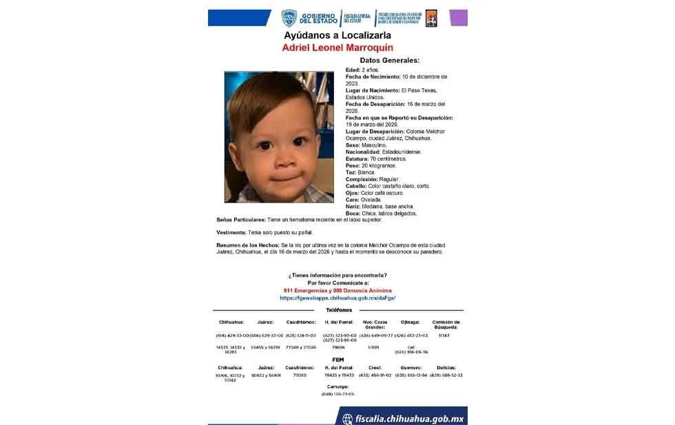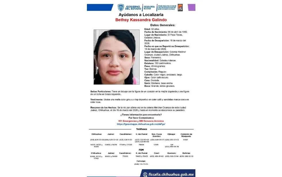 Juárez.- La Fiscalía Especializada en Atención a Mujeres Víctimas del Delito por Razones de Género (FEM) ha solicitado la colaboración urgente de la ciudadanía para localizar a Bethsy Kassandra Galindo, de 32 años, y a su hijo Adriel Leonel Marroquín, de apenas 2 años de edad. Ambos, ciudadanos originarios de El Paso, Texas, fueron vistos por última vez el pasado 16 de marzo en la colonia Melchor Ocampo de Ciudad Juárez, y hasta el momento se desconoce su paradero.