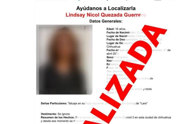 Chihuahua.- Elementos de la Agencia Estatal de Investigación (AEI) localizaron sana y salva a una adolescente de 16 años, de iniciales L.N.Q.G., quien contaba con un reporte de ausencia interpuesto ante la Fiscalía Especializada de la Mujer (FEM). La menor fue ubicada la tarde de este lunes en la colonia Cerro Grande, confirmándose que su integridad física no corría peligro.