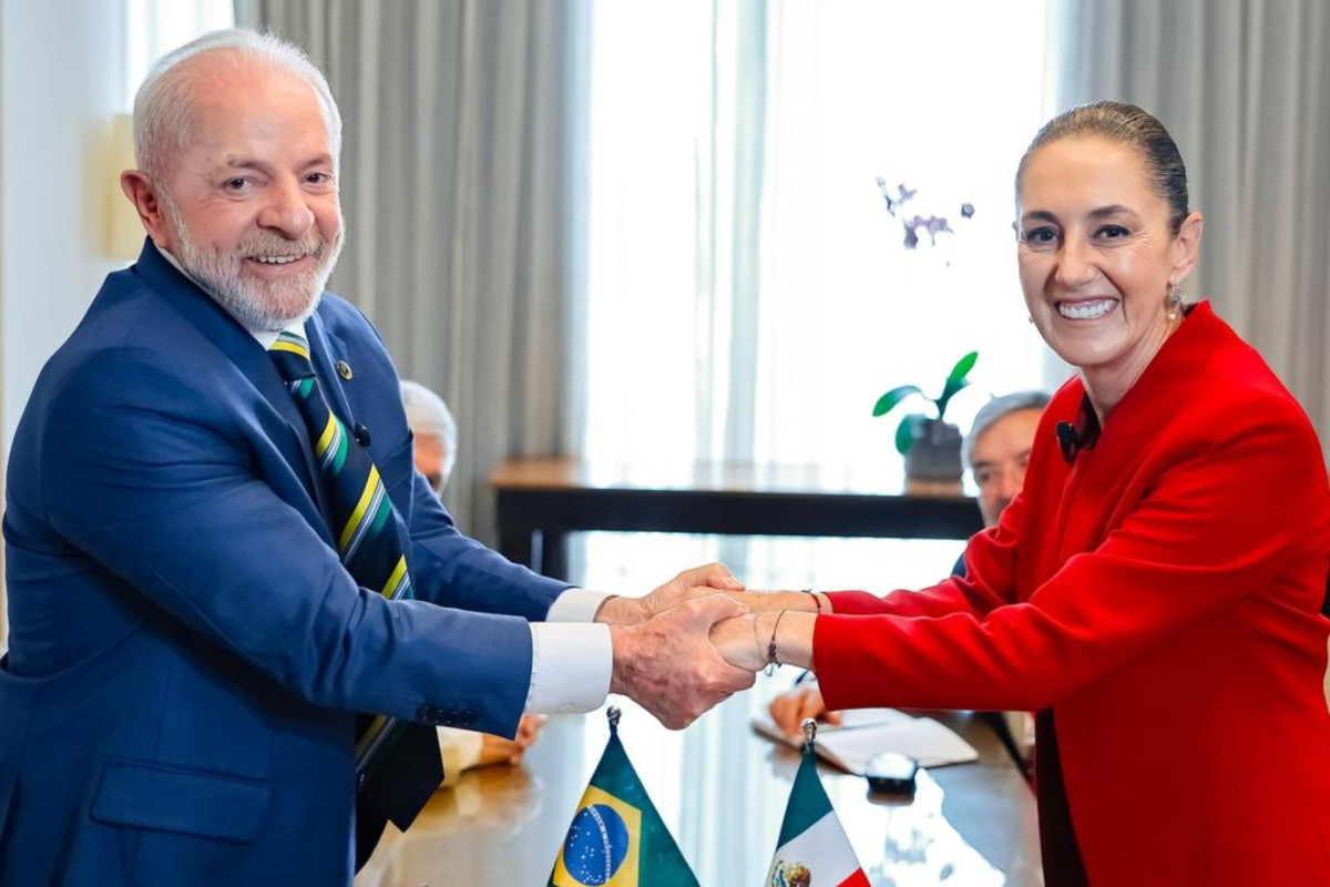 [Imagen de los presidentes Lula da Silva y Claudia Sheinbaum estrechando la mano frente a las banderas de Brasil y México]