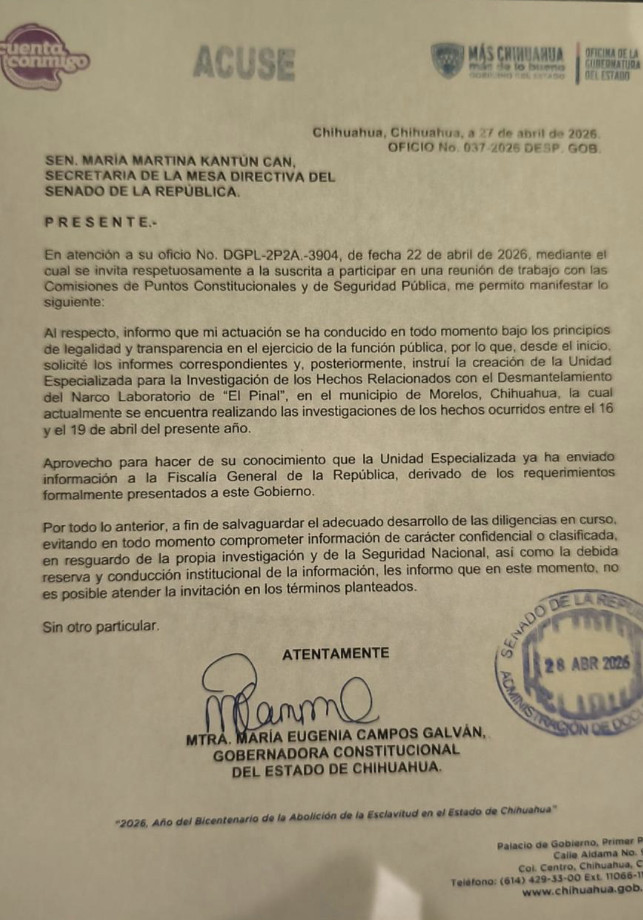 CHIHUAHUA, CHIH. – La gobernadora de Chihuahua, Maru Campos, notificó oficialmente su decisión de no asistir a la reunión de trabajo convocada por el Senado de la República. La mandataria estatal argumentó que su comparecencia podría poner en riesgo las investigaciones en curso sobre la presencia y actuación de agentes extranjeros en la entidad.