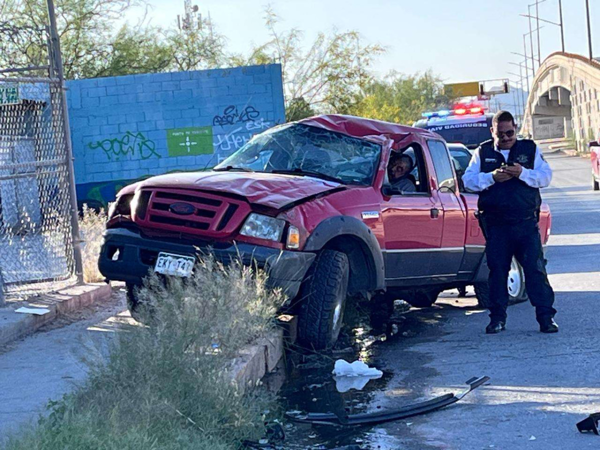 Juárez.- Un aparatoso accidente se registró sobre el Eje Vial Juan Gabriel, a la altura de la avenida Adolfo López Mateos, donde una camioneta Ford Ranger terminó volcada tras perder el control y saltar el camellón central. El conductor, un hombre de la tercera edad, sobrevivió al impacto con lesiones leves, a pesar de que la unidad invadió los carriles de sentido contrario.