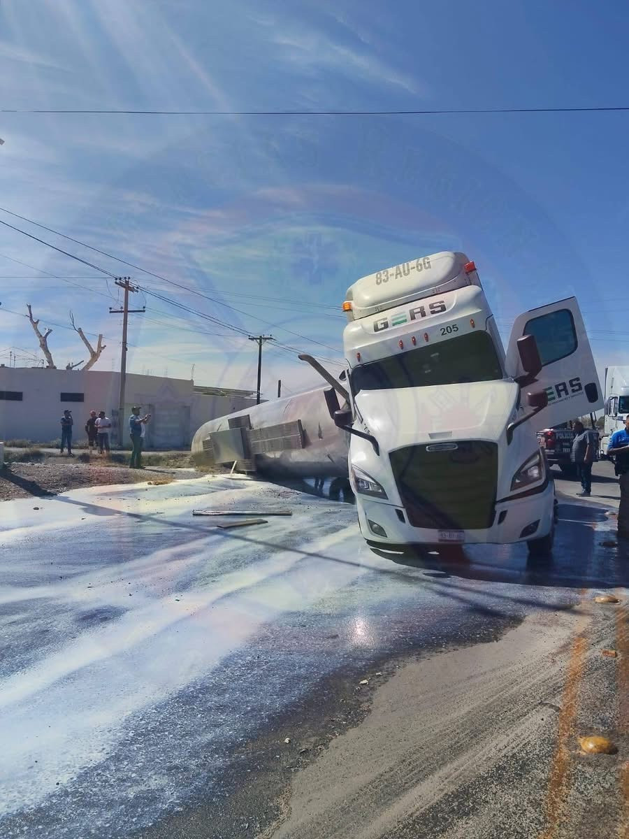 MEOQUI.— La tarde de este sábado, una aparatosa volcadura de un remolque tipo pipa cargado con leche provocó el cierre total de vialidades y una intensa movilización de cuerpos de emergencia en el cruce de la calle 20 de Noviembre y Bugambilias, en las inmediaciones de la Comandancia de Seguridad Pública Municipal.