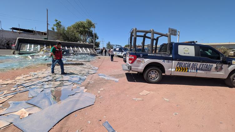 Chihuahua.- Una plataforma cargada con toneladas de láminas de vidrio volcó la mañana de este viernes en la curva que incorpora la Vialidad Sacramento hacia el Canal Teófilo Borunda. El exceso de peso en el remolque provocó que la unidad se venciera al tomar la curva en sentido norte-sur, bloqueando por completo la circulación y generando un intenso congestionamiento que obligó a la intervención urgente de la Policía Vial.